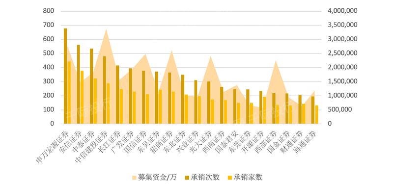 而累计发行最多的申万宏源证券共募集资金2,796,384.30万元,而发行费用也达7,647.50万元,费率约为0.27%,相比于A股上市费率的6%,费用相对较少,也即相关企业可以获得跟多的增发收入。并且体量较少的券商可以在新三板的增发项目中获得可观的收入。