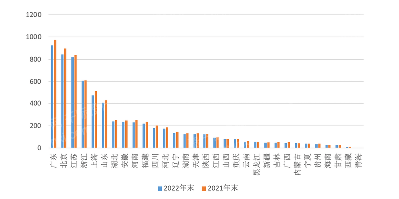 2021,2022年新三板企业的地区分布基本相同,以2022年为例,广东有925家,但青海西藏分别只有10家和2家,整体呈现自东向西,自南向北递减的趋势,反映出目前地区发展仍有较大的不平衡。目前投资资本主要集中在北上广等地区,而相应的这些地区的上市公司数量最多,因此会导致资本只在极个别地区循环,难以流通到全国范围内发挥更大的作用。