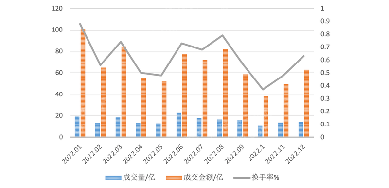 以2022年为例,整体上仍有较大波动,但1月份的成交金额最多为101.04亿元,成交量为19.43亿股,而6月份的成交金额为77.29亿元,低于1月份,而成交量却为22.78,成交金额与成交量的不协调变换说明随着挂牌公司数量的增加,投资并不局限于某几家优质公司,有更多的新型公司被关注。