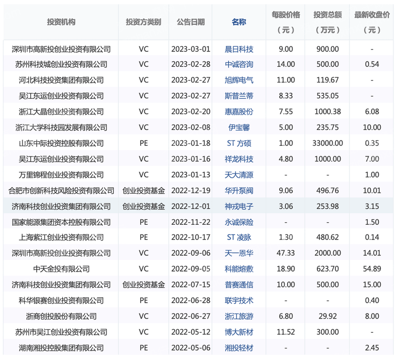 目前主要投资方有PE,VC和创业投资基金,但在上述20家投资机构中至少有5家出现了大幅亏损,以苏州科技城创业投资有限公司为例,其在2023年2月28日以14元的价格买入中诚咨询约35.7万股,而目前该公司股价为0.54元,买入总值贬值为19.29万元。但中天金投有限公司于2022年9月5日18.9元买入科能熔敷总值623.7万元,目前其股价为54.89元,总值升值为1811.37万元。由此不难看出,新三板虽然为机构和券商提供了新的退出方式和投资机会,但其本身仍有较大风险。