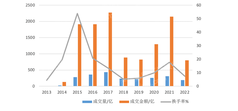2013至2022年股票成绩显示,新三板成交情况波动较为剧烈,2013年初建时交易情况惨淡,只有2.02亿股成交,金额也仅为8.14亿元,换手率也仅为4.47%,整体的融资效果并不理想,但随着相关制度的完善以及在2015年前A股牛市的到来,也拉动新三板的交易迅速膨胀,到2017年成交量达到了433.22亿股,成交金额为2271.8亿元,是2013年的280倍左右。但恶性的膨胀在2018年以交易金额跌至888.01亿元。随后2019年新三板的全面改革刺激新三板再次繁荣在2021年交易金额达到2148.16亿元。