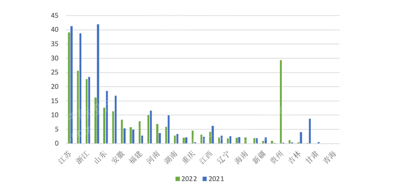 从地区来看,与各地区公司数量情形不同,江苏地区共发行109次,总值39.1亿元,超过广东发行96次,总值25.66亿元。此外江苏,广东,北京,上海等地区2022年的发行情况普遍低于 2021年。以北京为例,2021年的发行总值为41.93亿元,而2022年仅为16.19亿元,缩小了2058倍。相反安徽,福建,重庆,贵州等地却增长迅速。以贵州为例,2021年发行总值仅为0.26亿元,但2022却升至29.3亿元,甚至超过了广东上海等地区。