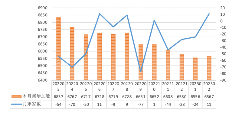从过去12个月的数据来看,新三板上市公司的数量大致呈下降趋势,并且2023年2月的数值为6567家,而2022年3月的数值为6837家,减少了270家,整体上看每月的增长数量基本稳定。并且2022年9月至2023年1月新增上市公司数基本均为负值,9月甚至出现减少77家现象,但减少的数量在逐渐减少,至今年2月再次出现了11家的增长,因此目前来看,新三板上市公司每月应维持约6600家的增长。