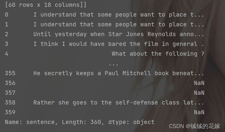 def task_nlp(data):# 去标点def de_punctuation(data):# 正则表达式去除两种引号,直接写会报错,因为空数据集存在,这里补一个try:def app_fun(series):try:series = re.sub(r'[\'\"]', '', series)except TypeError:return np.nanreturn seriesdata["sentence"] = data["sentence"].apply(lambda x: app_fun(x))print(data["sentence"])return data# 算词数def cul_wordcount(data):def counting(series):import jiebatry:seg_list = jieba.cut(series)# 返回的是一个迭代器直接循环遍历算了,反正之后还是要用的# 顺便去个空ret = [x for x in seg_list if x != " "]except:return []return retret = data["sentence"].apply(lambda x: counting(x))return ret.apply(lambda x: len(x)), ret# 建词典def build_dic(data):dict = {}def counting(series):for key in series:dict[key] = dict.get(key, 0) + 1data["token_word"].apply(counting)return sorted(dict.items(), key=lambda x: x[1], reverse=True)# 转日期def date_T(data):def fun(x):ret = re.findall(r'(\d{4})/(\d{1,2})/(\d{1,2})', x)[0]return "{}/{:0>2d}/{:0>2d}".format(ret[0], int(ret[1]), int(ret[2]))# 标准日期ret = data["date"].apply(fun)print(ret)# 这里实在没想到什么好看快速的写法,土方法吧splitt = ret.str.split("/", expand=True)print(splitt)data["date"], data[["year", "month", "day"]] = ret, splittreturn datadata = de_punctuation(data)print(cul_wordcount(data))data["word_count"], data["token_word"] = cul_wordcount(data)print(data)print(build_dic(data))data = date_T(data)print(data)return data# 空