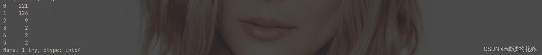 def countvalue(data:pd.DataFrame):data = data[["1 try", "2 tries" ,"k++"]].copy()print(data.value_counts())print(data["1 try"].value_counts(ascending=True))print(data["1 try"].value_counts(bins=5))print(data["1 try"].value_counts(sort=False))print(data["2 tries"].value_counts(dropna=False))