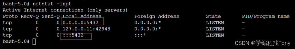 进入到postgres所在的容器中,输入 netstat -lnpt 可以看到当前5432端口确实处于监听状态 LISTEN。