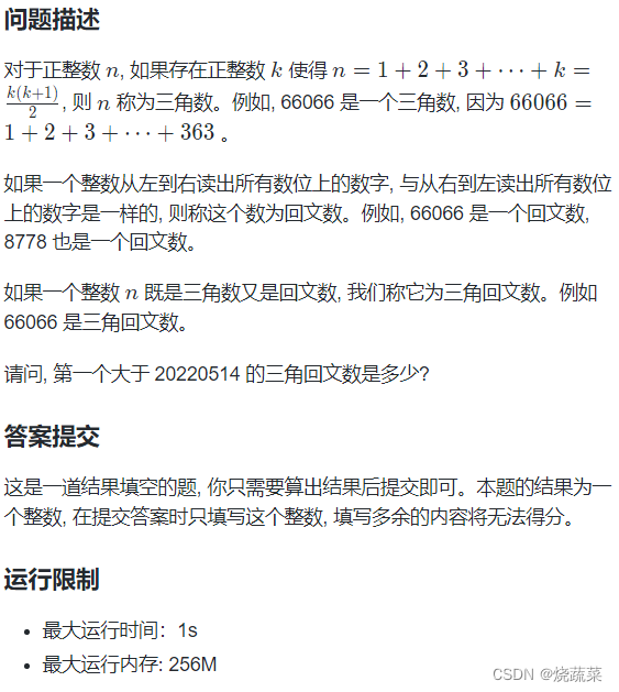 {for (int i = 367; ;i++) {if (i*(i+1)/2 > 20220514) {n = i*(i+1)/2;int t = n;int verify = 0;while (t) {verify = verify * 10 + t % 10;t /= 10;}if (verify == n) {cout << n;break;}}}return 0;