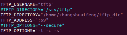 chmod 777 home/zhangshuaifeng/tftp_dir打开/etc/default/tftpd-hpa 文件,将其修改为如下所示内容:
