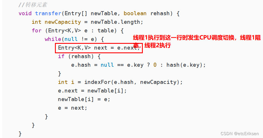 void transfer(Entry[] newTable, boolean rehash) {int newCapacity = newTable.length;for (Entry e : table) {while(null != e) {Entry next = e.next;if (rehash) { e.hash = null == e.key ? 0 : hash(e.key);//再一次进行hash计算?}int i = indexFor(e.hash, newCapacity);e.next = newTable[i];newTable[i] = e;e = next;}}}