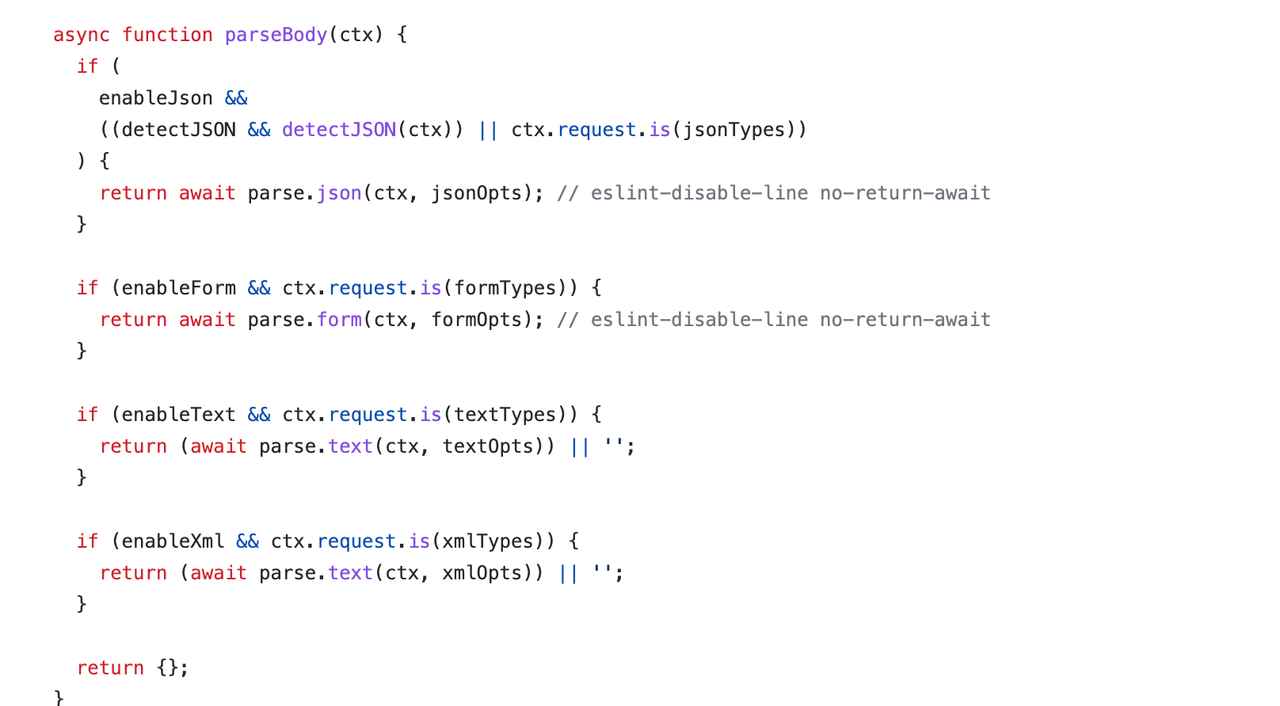 app.use(bodyParser());app.use(async ctx => {// the parsed body will store in ctx.request.body// if nothing was parsed, body will be an empty object {}ctx.body = ctx.request.body;