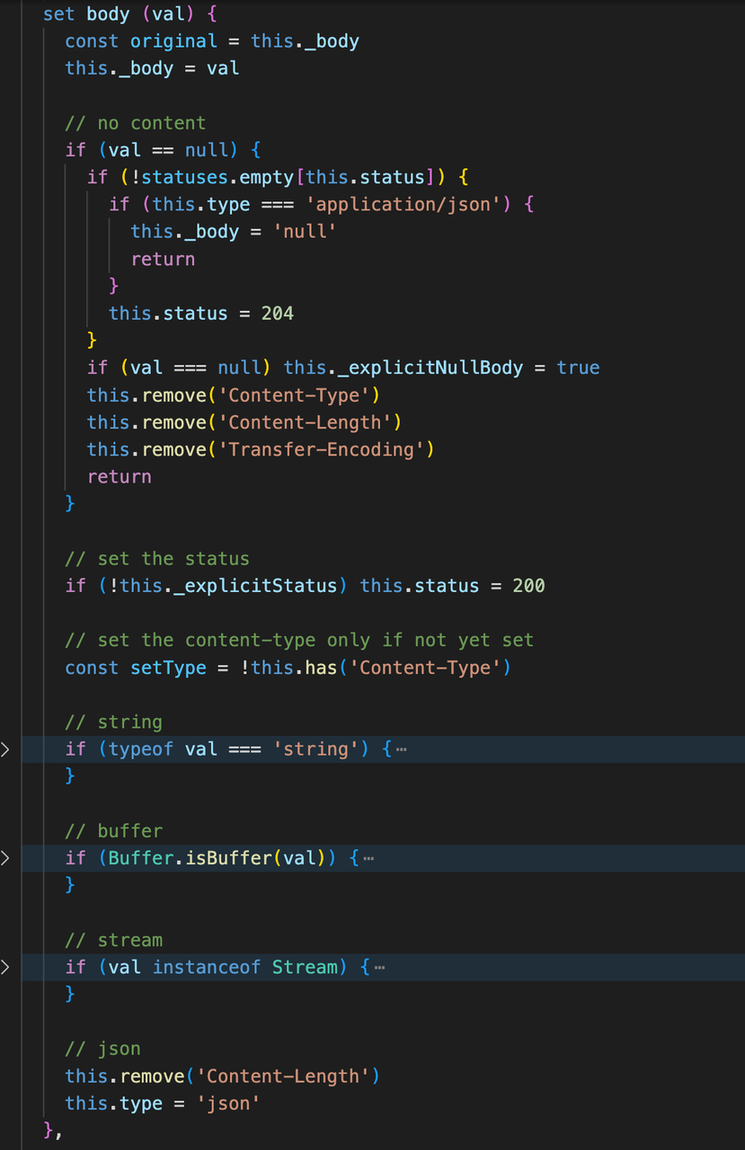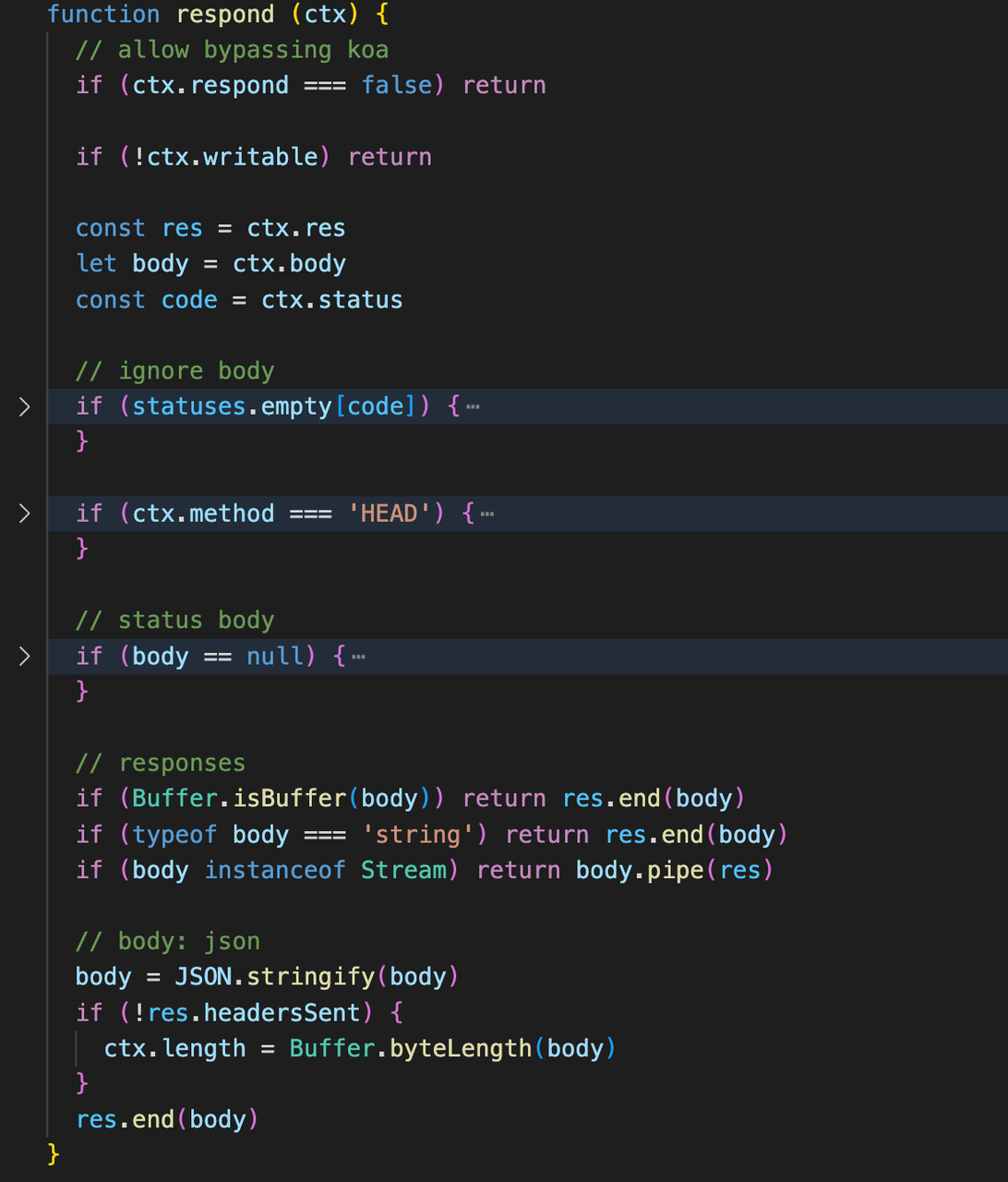 在koa中我们无需像Node.js中http需要显式调用res.end或者res.pipe进行响应的结束发送,因为在handleResponse的respond函数中处理了。它会根据我们在业务逻辑设置的不同的body的类型进行相关调用,例如如果是一个流则调用pipe进行流式返回、特定状态码不返回body、非buffer和string的body序列化成字符串等