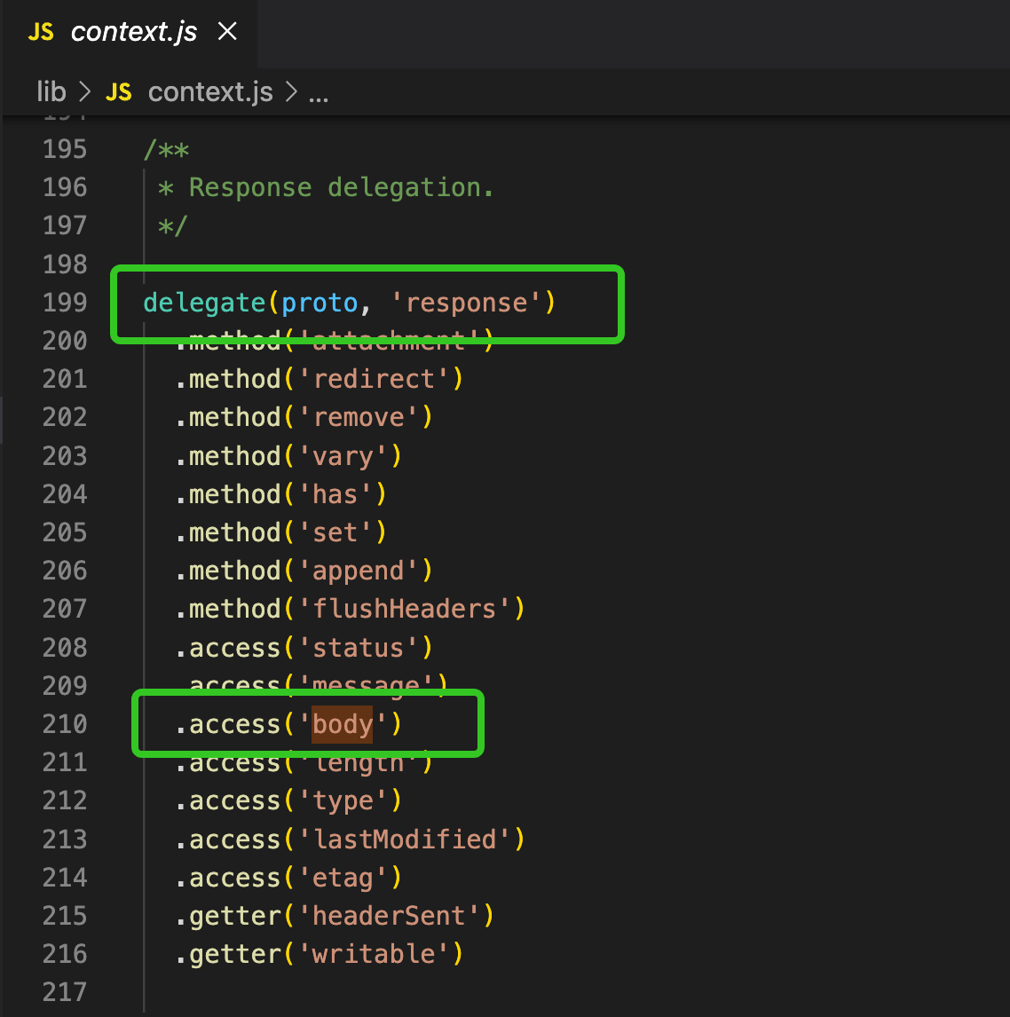 简单来说就是将对context对象上的操作代理到koa封装的request和response对象中去