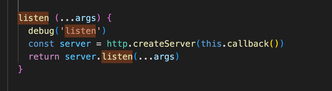 app.listen上面的使用demo,可以看到调用listen后就是监听指定端口运行起我们的http服务