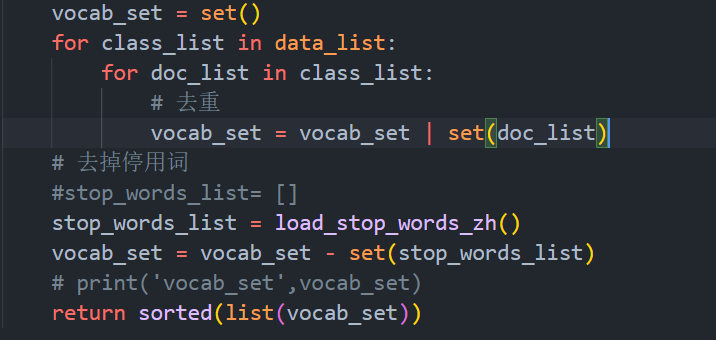 2)对其去重,去停用词。去重为了生成词汇表。在生成词汇表时,可用python自带的set集合来表示,集合中不会有重复元素。划分词语时,有些词语是没有实际意思的,对后续的关键词提取就会加大工作量,并且可能提取的关键词是无效的。所以在分词处理以后,引入停用词去优化分词的结果。所以要在词汇表中删除停用词。实现的代码为create_vocab_list()和load_stop_words()。停用词表为网上公开的数据集,提前保存到txt文件中。实现的代码如下: