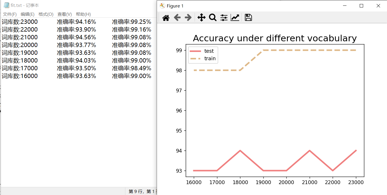 起初,词汇表为23983条词汇。将词汇随机选取18000条,测试是否拟合程度可以下降。结果为将20%的测试集放入测试,得到准确率为94.93%,将80%的测试集放入测试,得到准确率为98.83%,得出结论,该程序过拟合,并且当适当缩小词汇表规模的情况下,可以增加准确率。所以需要降低特征维度,也就是降低词汇表中的数据集数量,所以设计程序以1000的间隔遍历词汇表,观察测试集和训练集的准确率。程序运行的结果如下图: