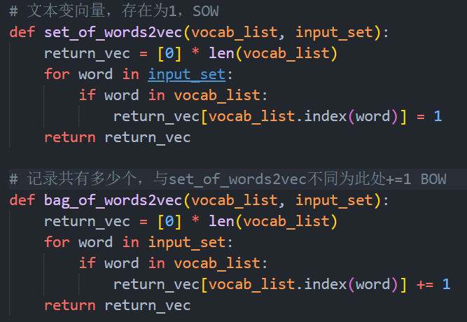3)文本向量化,以词为单位。分别利用如下的词集模型和词袋模型利用上述的词汇表将文本转换为向量。二者的不同点在于,对于重复出现的词在向量中的位置由1表示,还是由出现的次数表示。