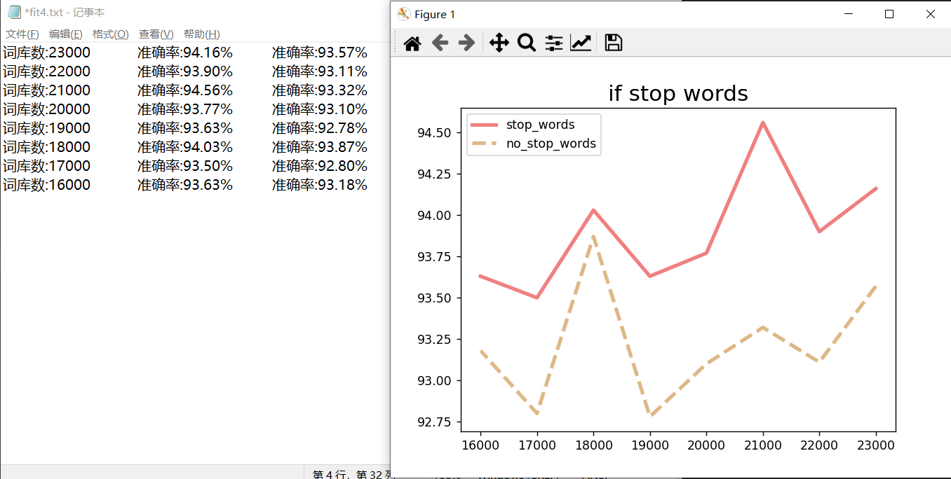 经过对比是否去掉停词,划分词语时,有些词语是没有实际意思的,对后续的关键词提取就会加大工作量,并且可能提取的关键词是无效的。所以在分词处理以后,引入停用词去优化分词的结果。所以结果如下图: