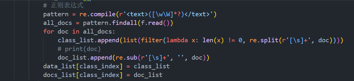 1)首先,将txt中的文本的不同标签下的数据提取,放置于一个二维列表中,因为是有监督学习,所以将同种类的文本放置于同一个维度下,实现代码为load_data_set()和get_data_list()。因为下载的文章有各种标签,所以要用正则表达式读取,实现的代码如下: