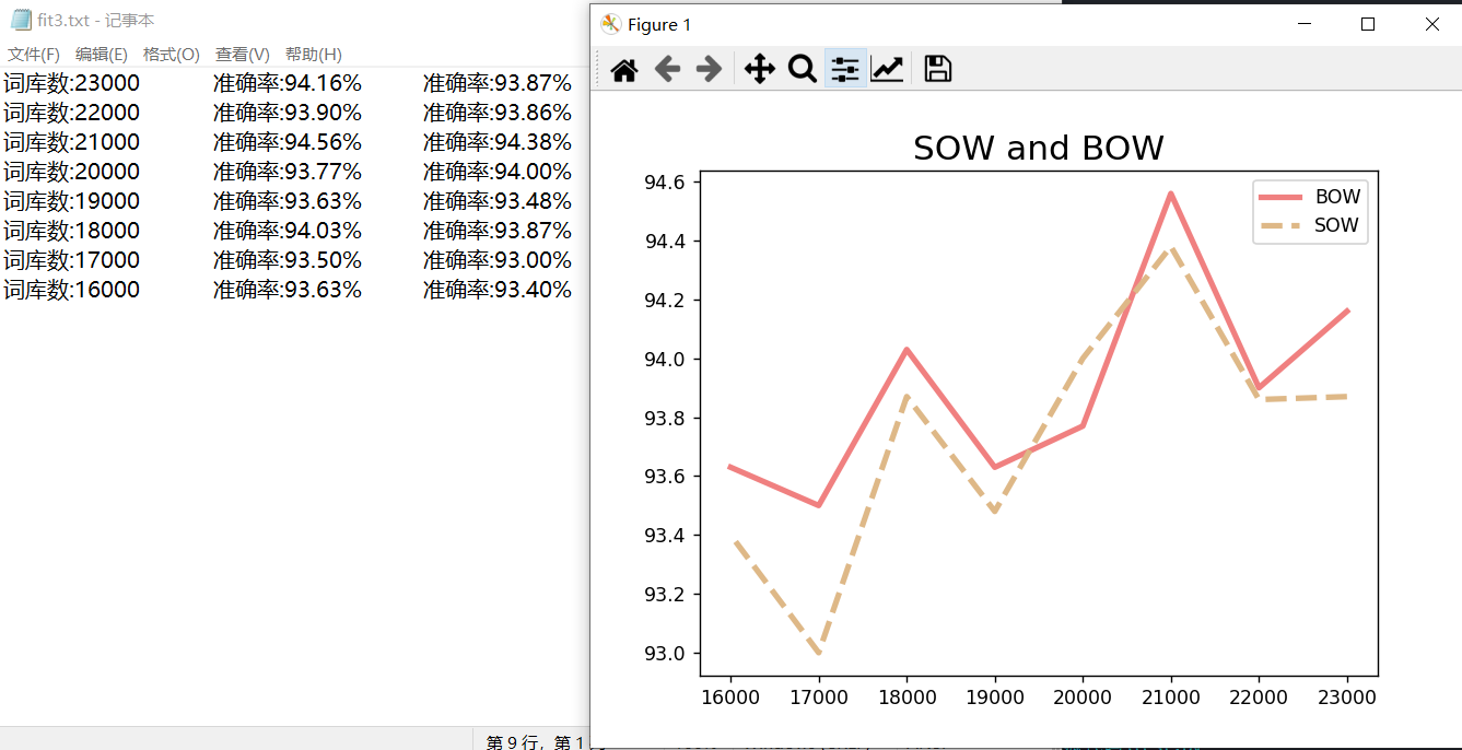 经过对比SOW和BOW模型下的准确率,发现BOW下的准确率略高于SOW,SOW是单个文本中单词出现在字典中,就将其置为1,而不管出现多少次。BOW是单个文本中单词出现在字典中,就将其向量值加1,出现多少次就加多少次。 所以BOW比SOW更能表现原始数据的特点吧,但是都是基于词之间保持独立性,没有关联为前提。这使得其统计方便,但同时也丢失了文本间词之间关系的信息。结果如下图: