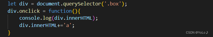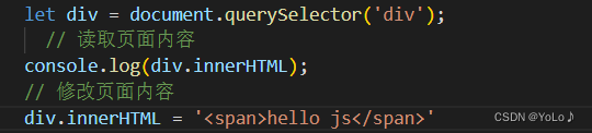 var div = document.querySelector('div');// 读取 div 内部内容console.log(div.innerText);// 修改 div 内部内容, 界面上就会同步修改div.innerText = 'hello js hello js';