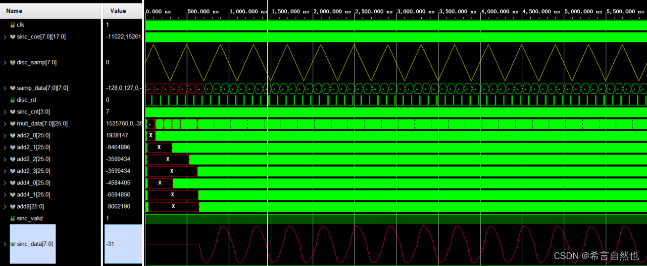 module sinc_process(input clk,input sinc_en,//插值使能标志input [7:0]disc_samp,//待插值数据,有符号数output disc_rd,//读取插值数据标志output sinc_valid,//插值数据有效标志output [7:0]sinc_data//插值后数据);