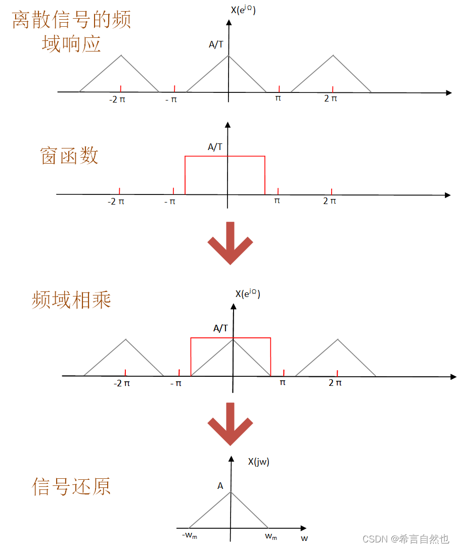 那么离散化的x[k]如何还原为原来的x(t)呢?时域上分析较为复杂,我们可以从频域上进行分析,即如何将频域响应还原成X(jw)。这样就比较直观了,只需要截取