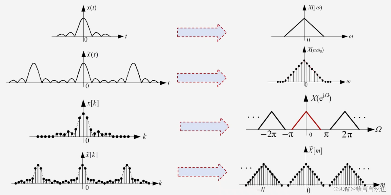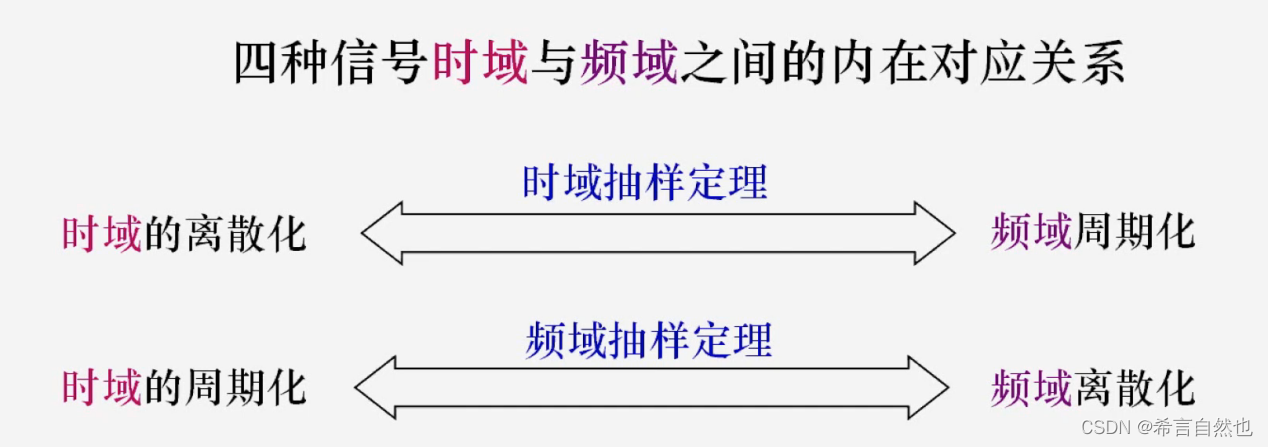 在进行正弦算法分析之前,我们回顾一下《数字信号处理》课程中,对于信号在时域与频域之间的映射关系,如下图。