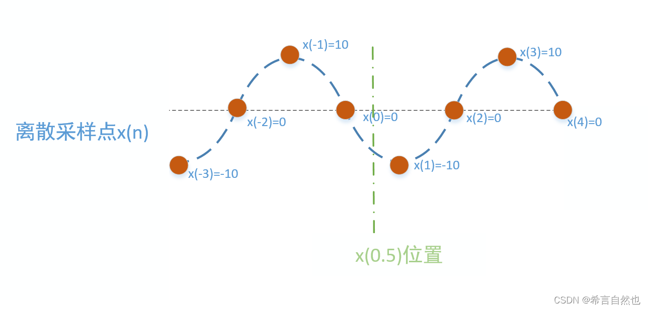 我们使用前后共计8个原始采样点,来求插值点x(0.5)的数值。套用上面描述的公式,即x(0.5)=x(-3)h(0.5-(-3)) + x(-2)h(0.5-(-2)) + x(-1)h(0.5-(-1)) + x(0)h(0.5-(0)) + x(1)h(0.5-(1)) + x(2)h(0.5-(2)) + x(3)h(0.5-(3)) =-6.3056,即求得插值点的数值。