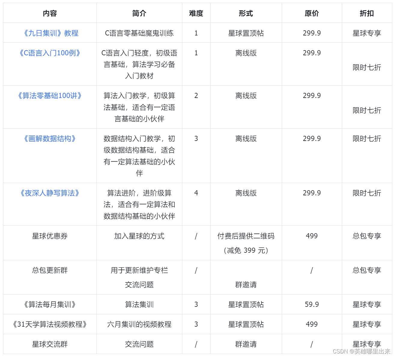 总包是包含从语言到算法整条路线的,相当于把 CSDN 打包,以离线包的方式提供,并且有专门的讨论群,后续有新的课程都会同步上新,无需再次付费,还也会赠送一张价值 399 的星球优惠券。总包+星球 是所有内容,当然不进星球问题也不大,主要用来打卡和集中训练,这个看自己的安排。