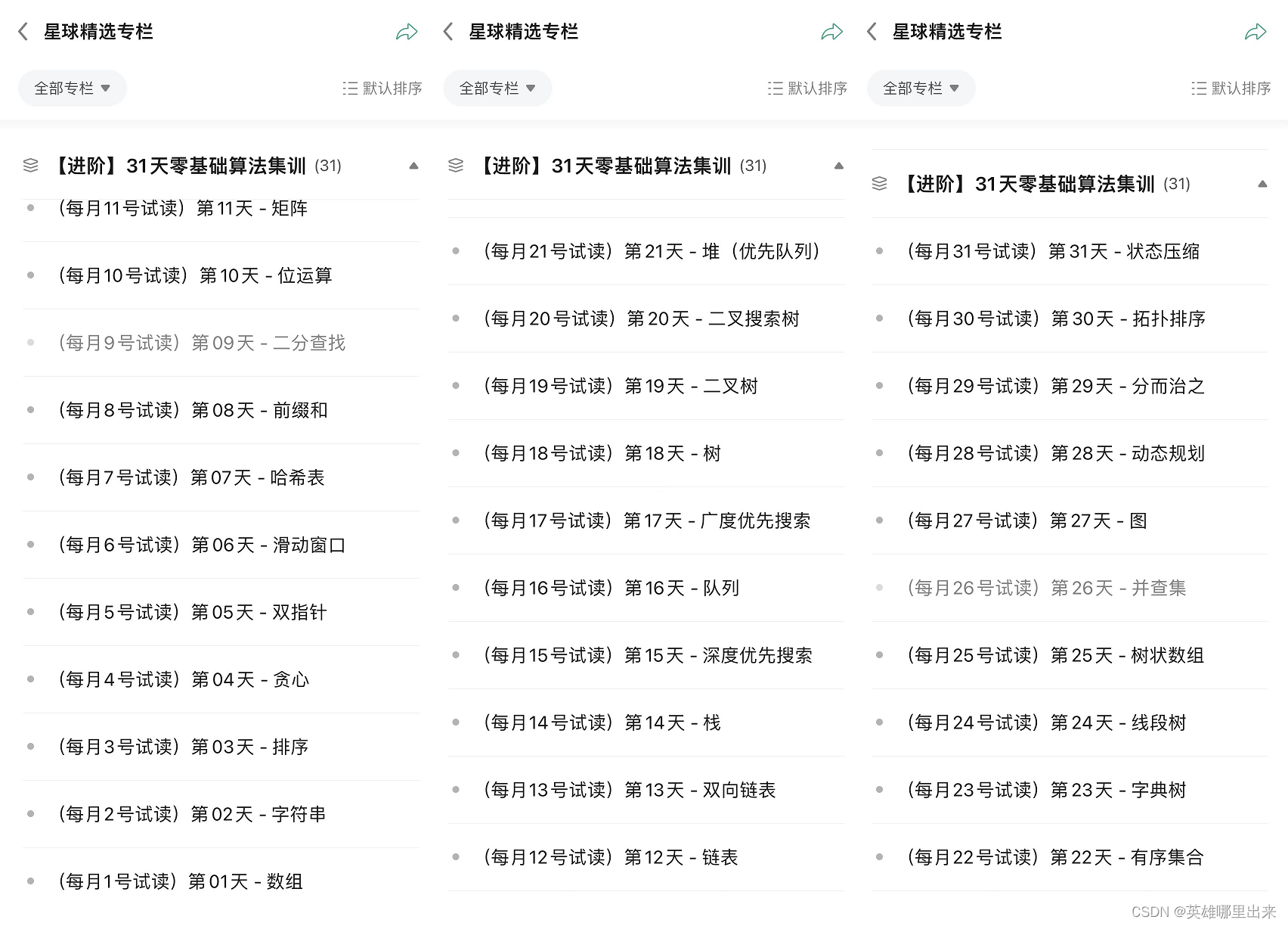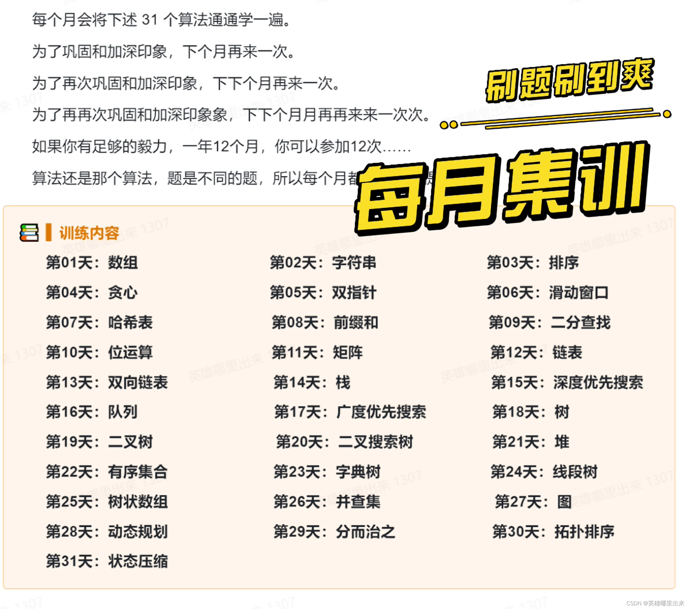 每天星主会发布一个作业,以月为周期。每个月的集训,每一天,会对应一篇试读文章进行试读,读完以后,做完给定的练习题。每个月的算法都是相同的,但是题是不同的,所以一年下来,如果跟上我的脚步,起码可以刷 1400+ 的题。