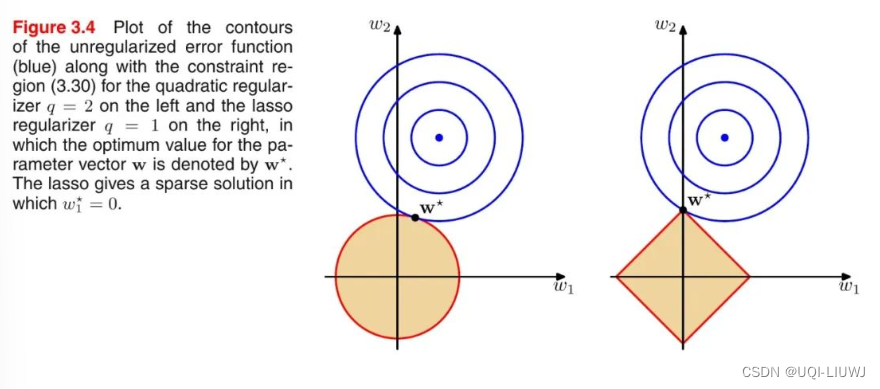 •  蓝色的圆圈表示问题可能的解范围,橘色的表示正则项可能的解范围