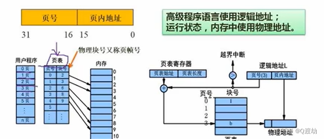 物理地址=块号+页内地址(内存中存放的是块号,所以可以通过内存的大小求块号的位数)