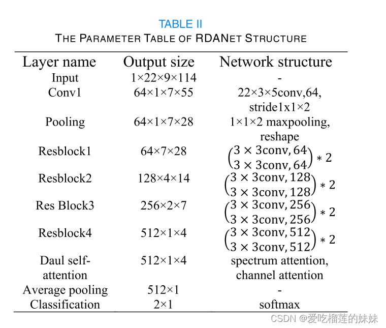 RDANet网络参数如表二所示。模型输入为1×22×9×114, 22为脑电信号通道数,9×114为谱图维数。每个卷积层后面都有一个批归一化、一个dropout和一个ReLu激活函数。我们首先将上述特征图输入卷积层,然后进行重构,得到一个64 × 7 × 28的矩阵。随后,我们使用4个ResBlock层来提取EEG信号的深层特征。一个融合全局特征的双自注意层随后是一个具有sigmoid激活函数的全连接层。我们采用交叉熵损失函数作为代价函数。批大小为32。