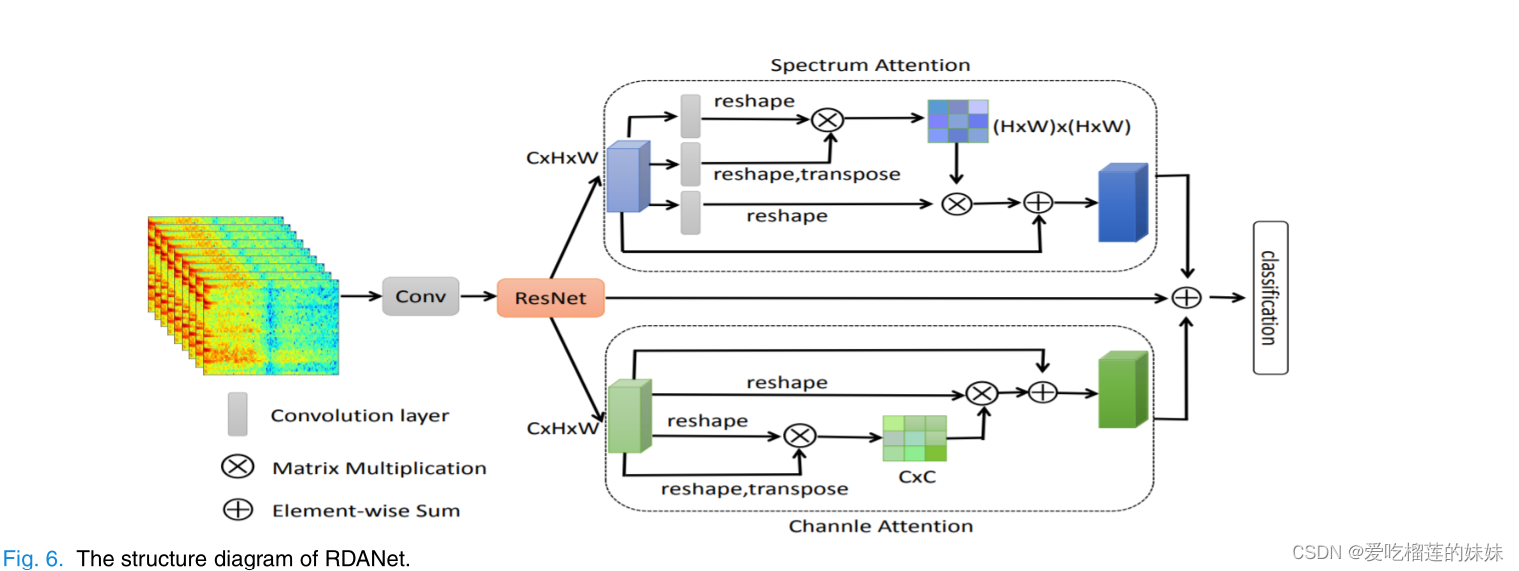 其中β初始化为0。为了充分利用信道和频谱上下文信息,我们对这两个注意模块进行了逐元素和的整合。与原始特征融合后,通过平均池化得到最终的特征图。