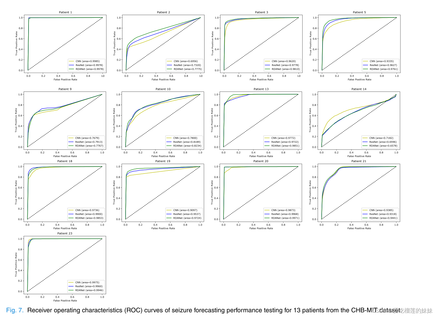 AUC是评价分类任务的综合参数,因此我们比较了三种模型测试不同患者的发作预测性能的ROC。在CHB-MIT数据集的13个病人的数据上评估CNN、ResNet和RDANet模型得到的ROC曲线见图7。可以看出,对于Pt1和Pt23,三个模型的ROC曲线几乎重叠,AUC值也几乎相同。