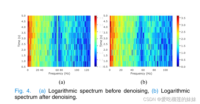 在脑电图数据分析中,时频域特征是非常重要的,通常采用二维图中表示三个参数的谱图进行研究。小波变换和短时傅里叶变换(STFT)是将脑电信号转换为[11]、[12]、[31]的常用方法。我们滑动5秒、15秒和30秒窗口,利用STFT将原始EEG信号转换为以时间和频率为轴的二维矩阵(如图3所示)。CHB-MIT数据集中大部分EEG记录受到60hz电力线噪声的污染,可以通过排除频率范围在57-63 Hz和117-123 Hz的部件来有效地去除。同时,直流分量(0 Hz)也被排除在外。5秒脑电图信号谱图和去噪谱图如图4所示。