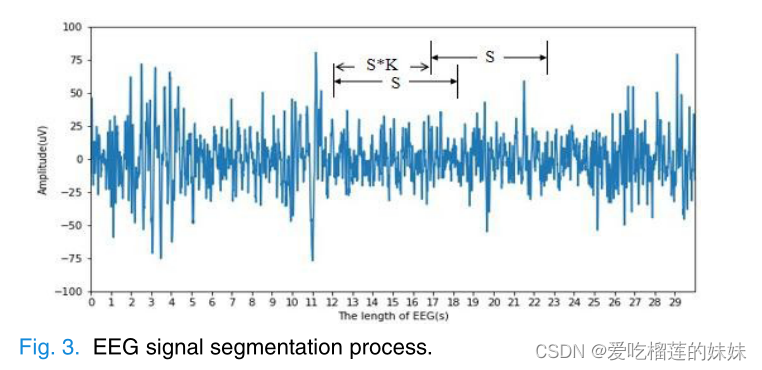 为了解决数据不平衡的问题,我们在训练阶段使用重叠采样来获得更多的预簇数据。如图3所示。具体来说,我们定义发作前信号的长度为M,发作间信号的长度为N,计算两类数据的长度之比K(公式1),设置采样窗口S为5秒。为了获得相同数量的两类数据,在训练阶段以S × K的移动步长收集癫痫发作前的数据,以S的移动步长收集发作间期的数据。对EEG信号进行分割,分别得到a和b的发作前和发作间期信号片段(见公式2和3)。
