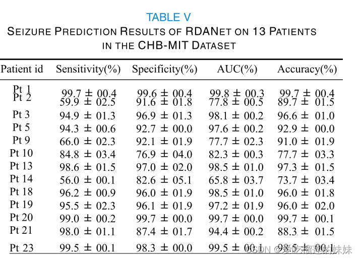 以预测5s段为目的,CNN、ResNet和RDANet模型在CHB-MIT数据集的13个案例上的评估结果分别显示在表III、IV和V。实验执行了两次,报告了带有标准差的平均结果。总的来说,数值实验表明,模型的性能因病人而异。如表三所示,Pt2、Pt9和Pt14的结果低于其他病人。这是合理的,因为Pt 2只包括3次发作,而且可用于训练的发作前记录很少,这使得简单的CNN模型难以提取发作前数据的特征。Pt 9有46.7小时的发作间期记录,但只有4次发作,这导致了极不平衡的数据和糟糕的分类性能。同样,Pt14只有少量的间歇期记录,这使得CNN模型难以达到高分类性能。