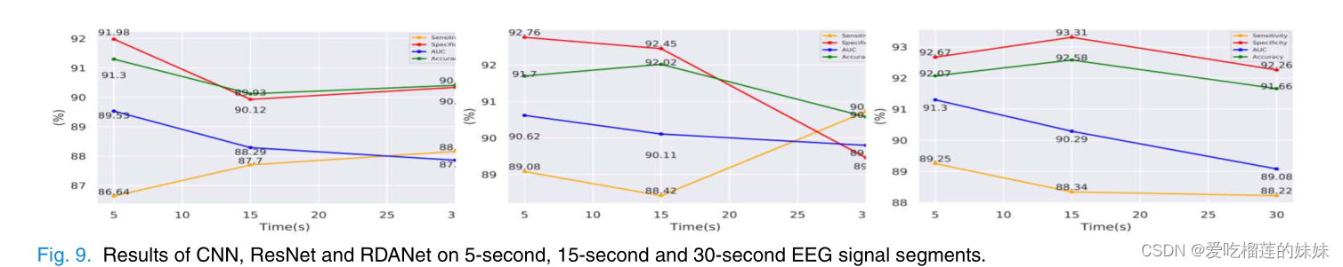 图9是CNN、ResNet和RDANet模型在5秒、15秒和30秒的EEG信号预测段上的评估对比图。实验结果表明,虽然一些模型的灵敏度提高了,但特异性却相应降低了。通过比较AUC和准确率等综合指标,可以看出,当预测长度增加时,三个模型的预测性能普遍下降。