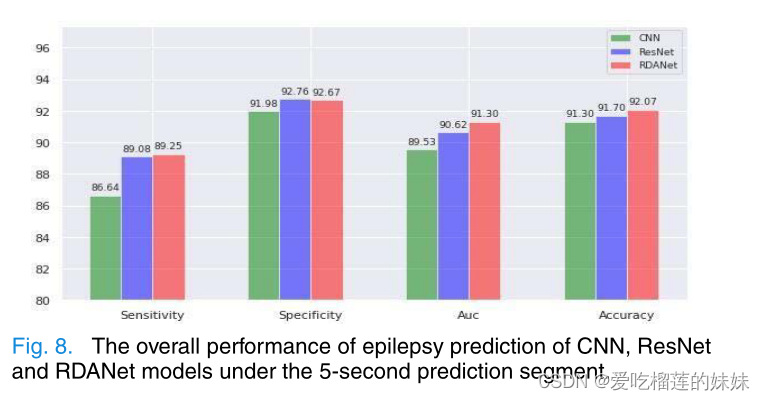 为了检验我们的模型,CNN、ResNet和RDANet模型的整体癫痫发作预测性能可以用上述结果的加权平均值来表示(见图8)