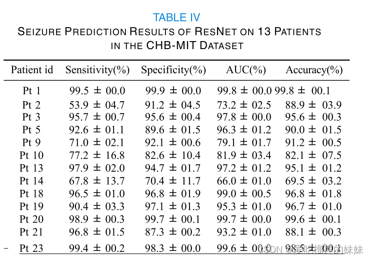表四显示了ResNet模型对同一数据集中13名患者的评估结果。与表三相比,Pt9和Pt14的预测结果有明显改善。Pt2的敏感性稍有下降,但特异性同时提高,导致AUC和准确率相应提高。看来ResNet模型通过快速连接和更深的网络结构可以缓解数据不平衡的问题是合理的。与CNN模型相比,也可以证明ResNet模型对其他患者的预测性能明显提高,除了Pt2。