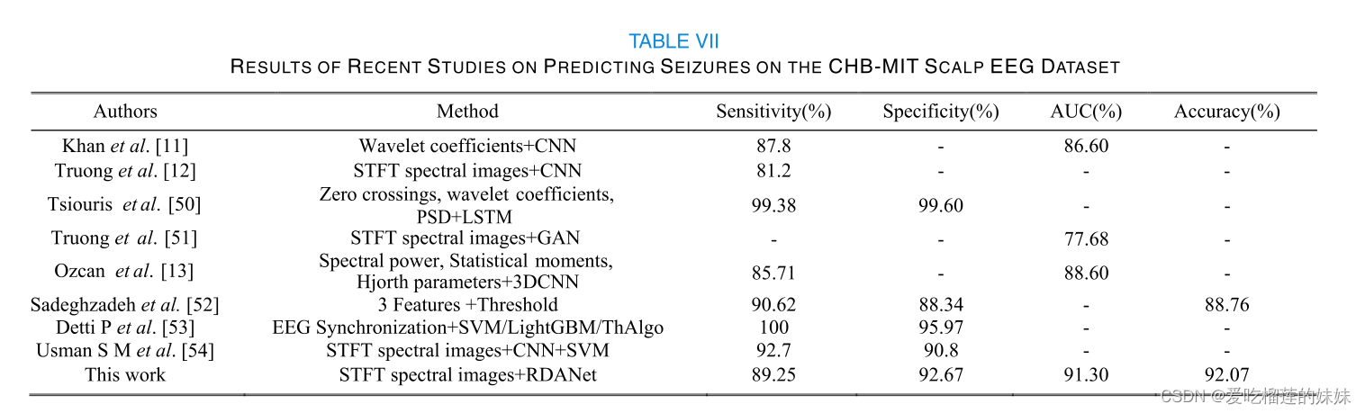 Truong等人[51]使用生成对抗网络(GAN)来预测癫痫发作,获得了77.68%的AUC。由于他们的方法采用了半监督训练,训练数据量不足,导致监督训练的预测性能出现差距。Ozcan等人[13]提出了一个多帧3DCNN模型来预测癫痫发作。在使用相同数量的病人和相同的发作期的条件下,我们提出的RDANet获得了88.63%的敏感性,FPR为0.122/h,AUC值为89.91%,准确率为89.78%。我们的方法的灵敏度和AUC都高于Ozcan的方法。Hoda等人[52]提出了一种实时低计算量的癫痫发作预测方法。他们提取了早期发病信号的第三级特征,并将第三级信息与预定义的阈值水平进行比较,以确定提取的特征是否与癫痫有关。除灵敏度外,其他两项指标相对较低。