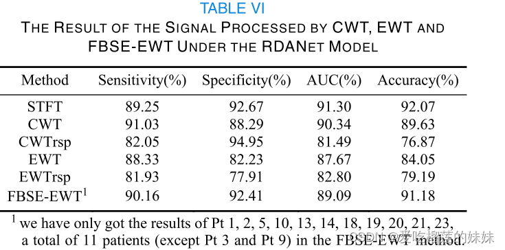 与STFT+RDANet相比,CWT+RDANet模型的灵敏度达到了91.03%,但其他三项指标相对较低,尤其是特异性。我们可以看到,STFT和CWT分别在发作间期和发作前期信号上表现良好。EWT+RDANetmodel的四项评价结果都很好。可能是时频域的信号特征更有利于区分脑电信号的不同状态。CWTrsp+RDANet和EWTrsp+RDANet表示下采样后的模型,其预测结果很差。原因可能是脑电信号中的一些重要信号由于下采样而丢失。