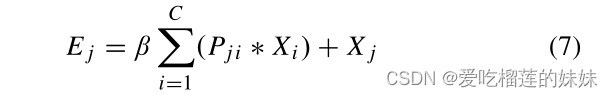 接下来,我们对P和X执行矩阵乘法,然后将结果重塑为RC×H×W。我们将结果乘以缩放参数β,并对X执行元素和运算,以获得最终输出E∈RC×H×W[33](如公式7所示),