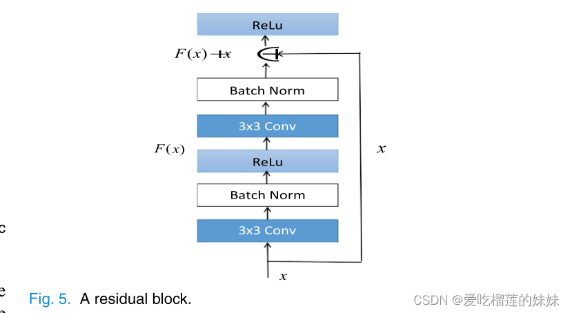 1)残差网络:CNN[34]已广泛应用于计算机视觉、自然语言处理等领域。根据科学研究,为了获得表达能力,更好地拟合潜在映射关系,加深网络层数或拓宽网络结构是有效的。随着神经网络层数的加深,会出现梯度消失的问题,随机梯度下降的优化变得更加困难。最近,He et al.[35]提出了一种ResNet来解决训练非常深的卷积网络时的上述问题,该卷积网络由几个残差块组成。如图5所示,残差块通过快捷连接向网络添加了一个身份映射,既不增加额外的参数,也不增加计算量,在一定程度上解决了模型退化问题。每个残差块由两个3 × 3卷积层、批归一化和ReLu组成。此外,它有两条路径相加,即残差路径F(x)和身份映射x。在本研究中,我们使用了4个残差块,它们相互连接。
