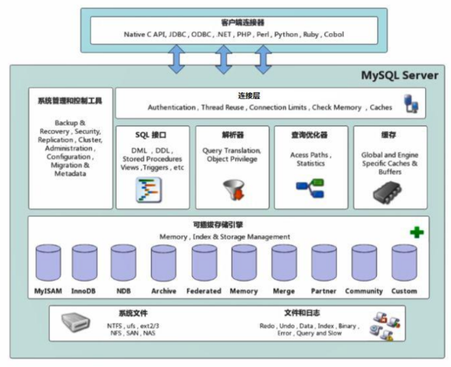 存储引擎层,存储引擎真正的负责了 MysQL 中数据的存储和提取,服务器通过 API 与存储引擎进行通信。不同的存储引擎具有的功能不同,这样我们可以根据自己的实际需要进行选取。