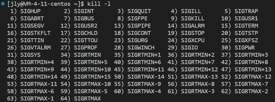 使用kill -l查看所有信号。使用信号时,可使用信号编号或它的宏。