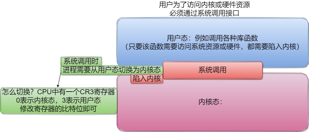在进行用户态->内核态的切换过程中,首先通过CR3寄存器将进程状态由用户态修改为内核态(陷入内核),在本进程的内核空间中找到物理内存中的内核代码进行执行,执行完毕后将结果返回给进程。