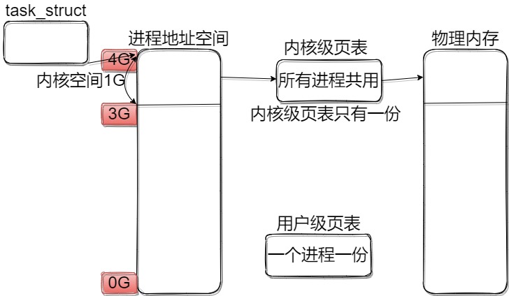 每个进程的虚拟地址空间中有一块1G大小的内核空间,通过内核级页表映射的方式找到物理内存中内核代码进行执行。