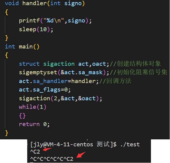 signum:信号;act:结构体对象;oldact:输出型参数,记录原来的act对象